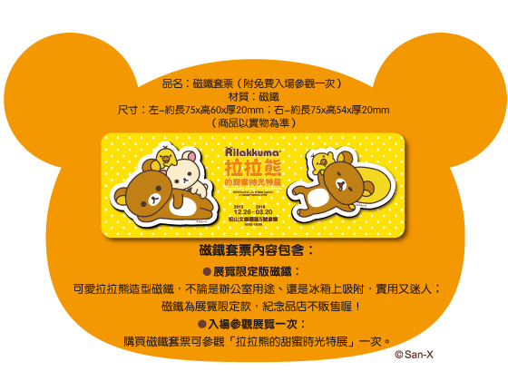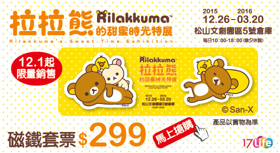 | 拉拉熊的甜蜜時光特展-磁鐵套票組合-臺灣首次拉拉熊™為主題的大型展覽!邀請您進入不同主題時光,盡情地與拉拉熊、小白熊和小雞一同遊玩享樂!只要299元即可購得【拉拉熊的甜蜜時光特展】單人門票一張+限定版 售價:299 我要購買 |